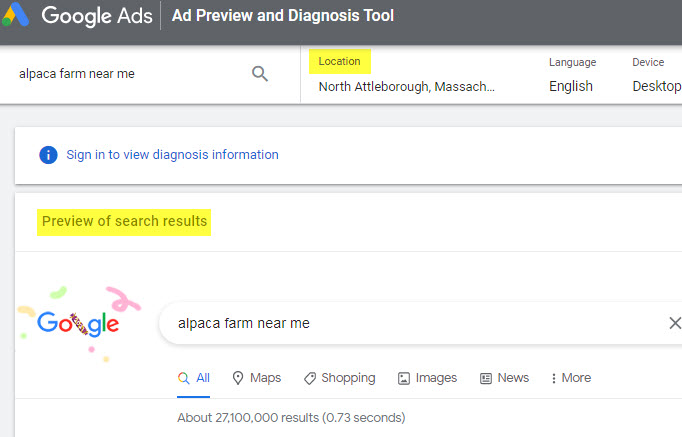 You do that for two reasons: (1) to confirm the accuracy of the rankings you’ve seen on your computer, on your phone, or in your rank-tracker, and (2) to allow you to check your rankings in various cities without needing to include the city IN the search term.  The Ad Preview tool lets you specify a default search location (which you haven’t been able to do in a typical Google search for years).