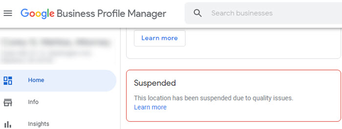 5. Confirm that your Google Business Profile page has not been hard-suspended (that is, removed from the Google Maps results). That was probably the first thing you checked, but if not, now is a good time to determine the status of your page. It’s a “soft” suspension if Google has locked you out of your page until you re-verify, but you can still find your page in Google Maps.  It’s a “hard” suspension if your page is nowhere to be found when you search for it by name.