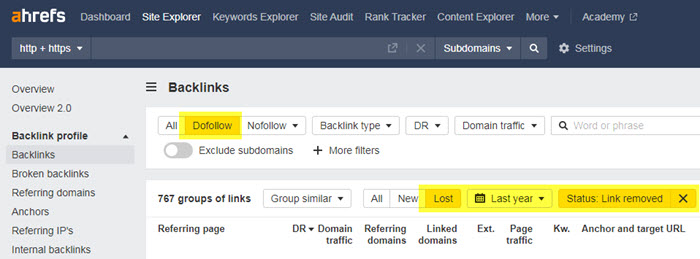 I use and recommend Ahrefs for all kinds of link research, including for seeing links that might have tumbled off the truck.