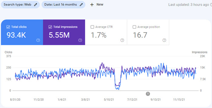 Look at a nice, long date range – like the last 12-16 months.  Which specific pages have dropped in impressions?  Did most of your impressions and/or clicks come from just a few terms you ranked well for?  If so, did you just drop from page 1 or page 2 for those terms?  If you blog or create other “content,” did your biggest blog posts drop in impressions or clicks, but your homepage and “service” pages are still truckin’?  Those are just some of the big questions to look into.  But don’t let me tell you exactly where to look: If you simply spend some time sifting through the “Performance” area of Search Console, you’ll be amazed at what you learn.
