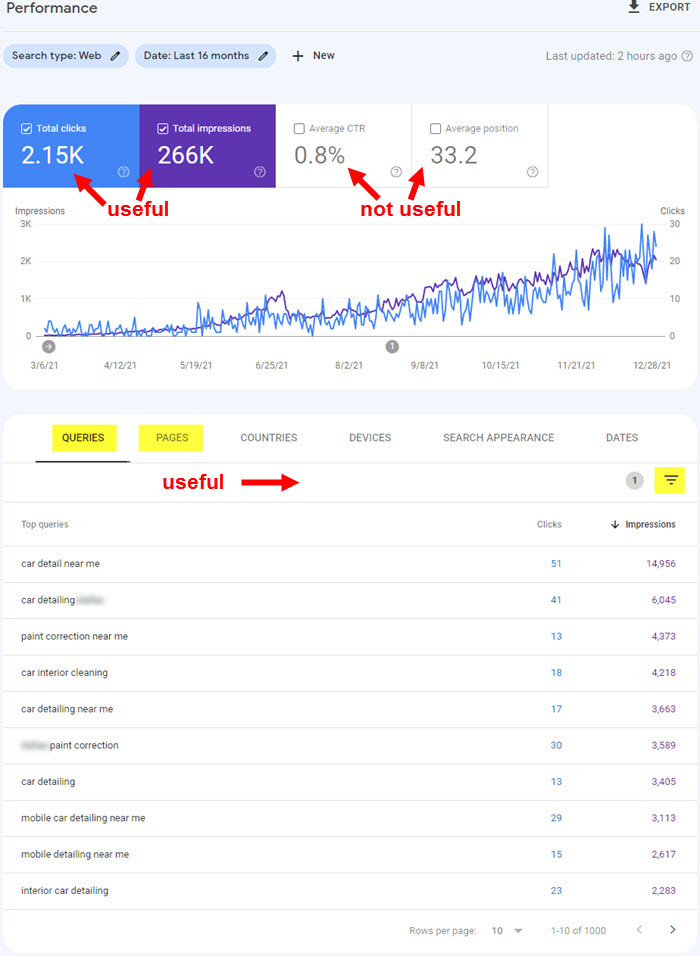 1. Dig through Google Search Console – especially in the “Pages” and “Queries” area (under “Performance”) – and look for patterns. The idea is to zero in on exactly where and when you took a hit. Traffic may be down but your visibility is still OK.  Or your visibility is only down in some areas but not in others.